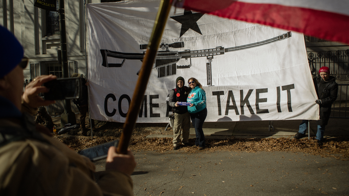 Participants pose with a sign that reads 'come and take it' as the Virginia Gun Rally organized by the Virginia Citizens Defense League comes to an end outside the Virginia State Capitol in Richmond, Va. on Jan. 20. Thousands converged both to rally and to lobby lawmakers against proposed state gun restrictions.