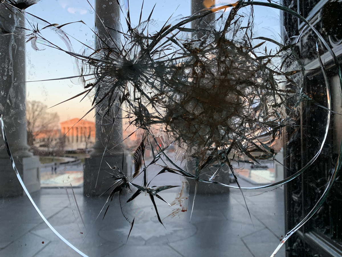 A window at the US Capitol building broken during the 6 siege by supporters of US President Donald Trump.