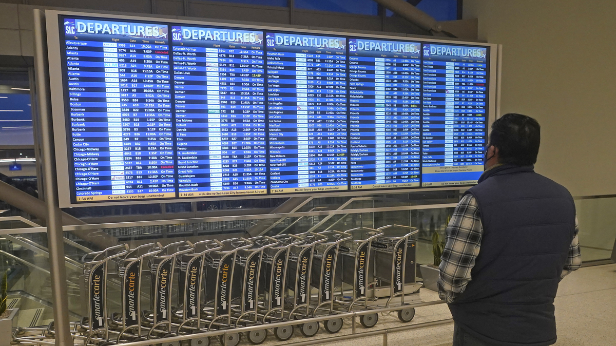 A man looks at the departures board at Salt Lake City International Airport on Friday. Thousands of flights have been canceled over the Christmas weekend in the U.S. alone, with airlines citing bad weather and the pandemic.