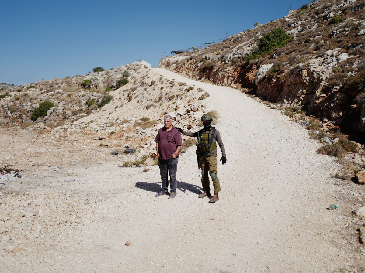 Israeli soldier detaining olive farmer Ayoub Abu Hejleh in the occupied West Bank on Nov. 7, 2023. Abu Hejleh says he has been unable to harvest his olives because Israeli soldiers and settlers have have blocked him from his land since the war in Gaza started on October 7th when Hamas insurgents attacked Israel, killing more than 1,400 people.