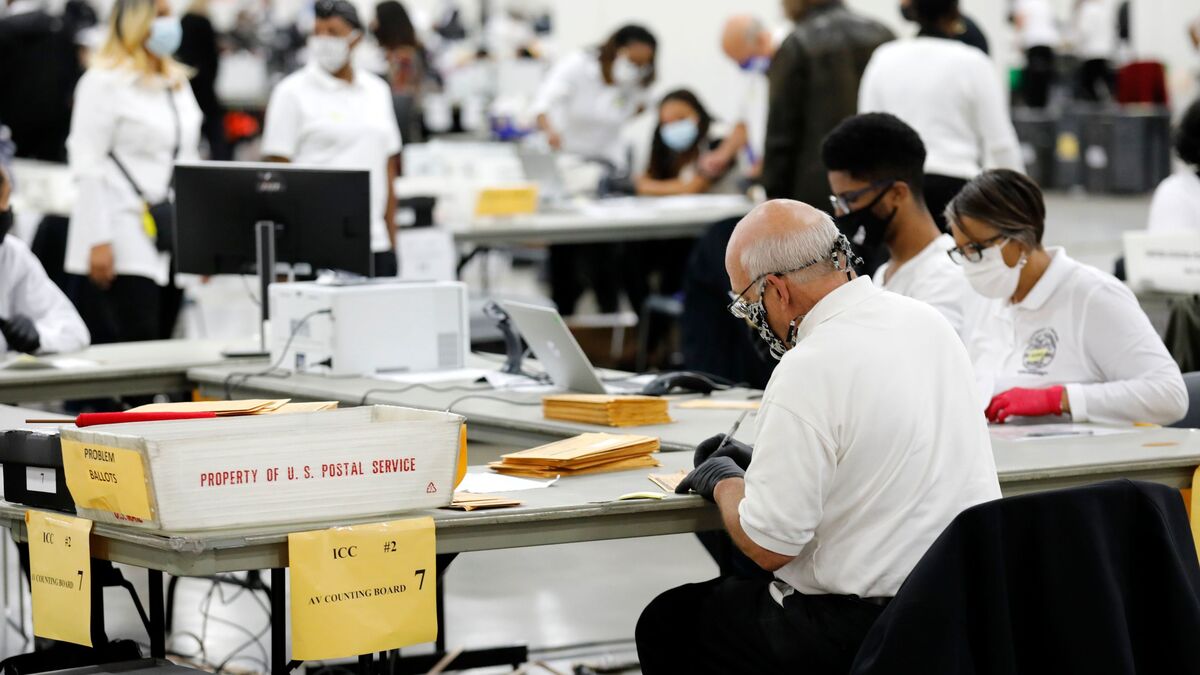 Detroit election workers work on counting absentee ballots for the presidential election at TCF Center on Wednesday.