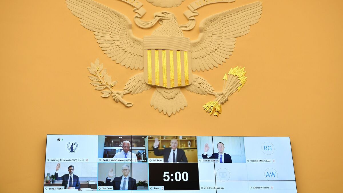 Amazon CEO Jeff Bezos, Facebook CEO Mark Zuckerberg, Google CEO Sundar Pichai, and Apple CEO Tim Cook are sworn-in before the House Judiciary Subcommittee on Antitrust, Commercial and Administrative Law.
