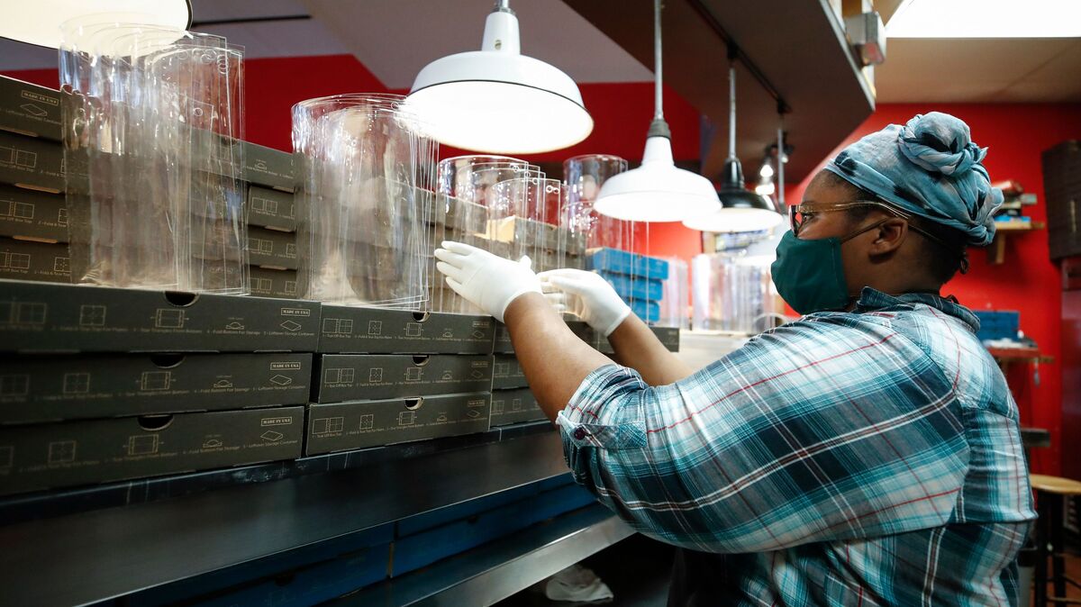 Marquisha Byrd makes acrylic face shields for front line responders at Dimo's Pizza in Chicago, Illinois. The government reported Thursday that another 5.2 million U.S. workers filed for unemployment benefits, taking the four-week total to 22 million, a staggering figure in a downturn that economists say presents the country with its most severe outlook since the Great Depression of the 1930s.