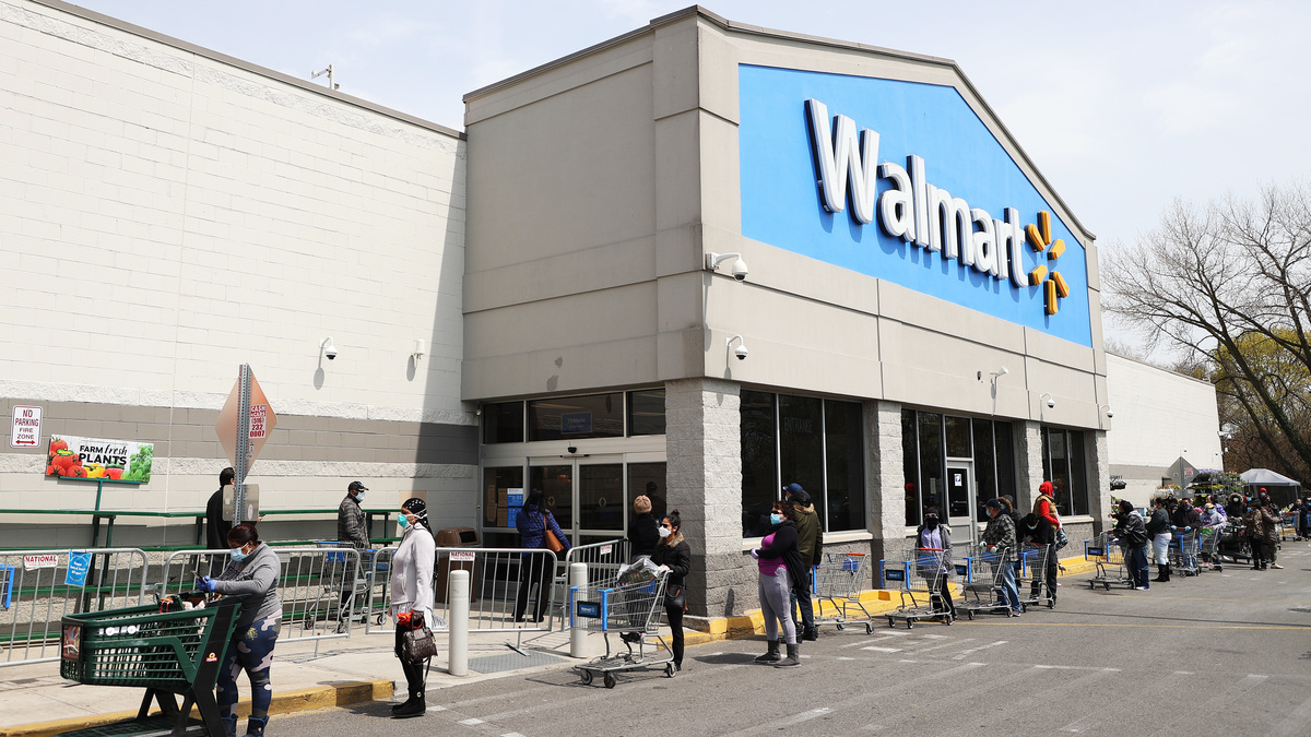 People wearing masks and gloves wait to enter a Walmart on April 17 in Uniondale, New York. Walmart announced they will require customers to wear masks beginning next week, becoming the largest retailer to instate a mask mandate in the United States.