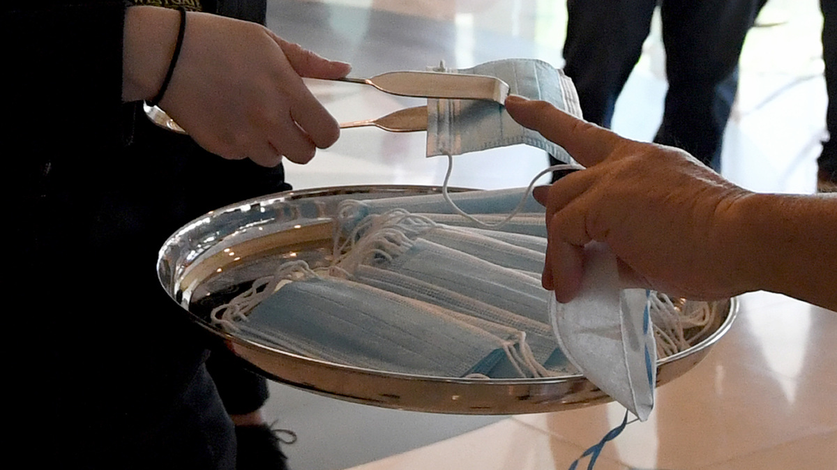 Tongs are used to give surgical masks to guests entering the Westgate Las Vegas Resort & Casino in June. An NPR report found that new surgical mask suppliers have jumped into the market and in some cases, are selling defective products. Some sellers have even touted FDA certificates that don't have any regulatory meaning.