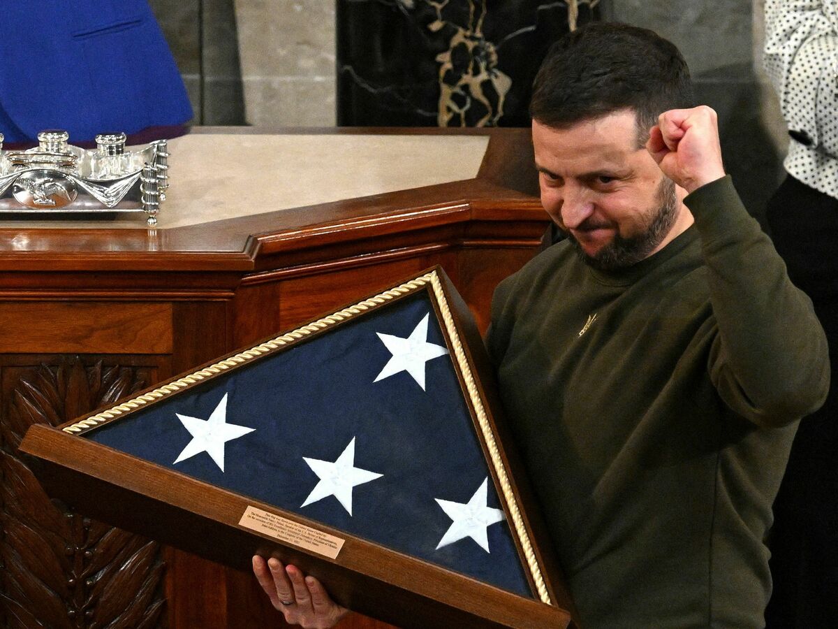 Ukraine's President Volodymyr Zelenskyy holding a US flag given to him by then House Speaker Nancy Pelosi (D-CA). Nearly a year later he's back in Washington to ask lawmakers for more aid.