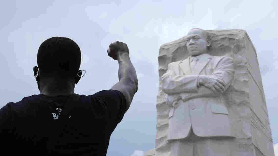 A man kneels and raises his fist in the air during a march and protest to mark the Juneteenth