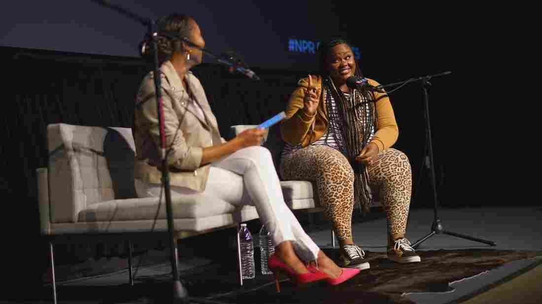 Audie Cornish and Nicole Byer (right) speak at the Downtown Independent theater in Los Angeles. Matthew Nadu for NPR hide caption