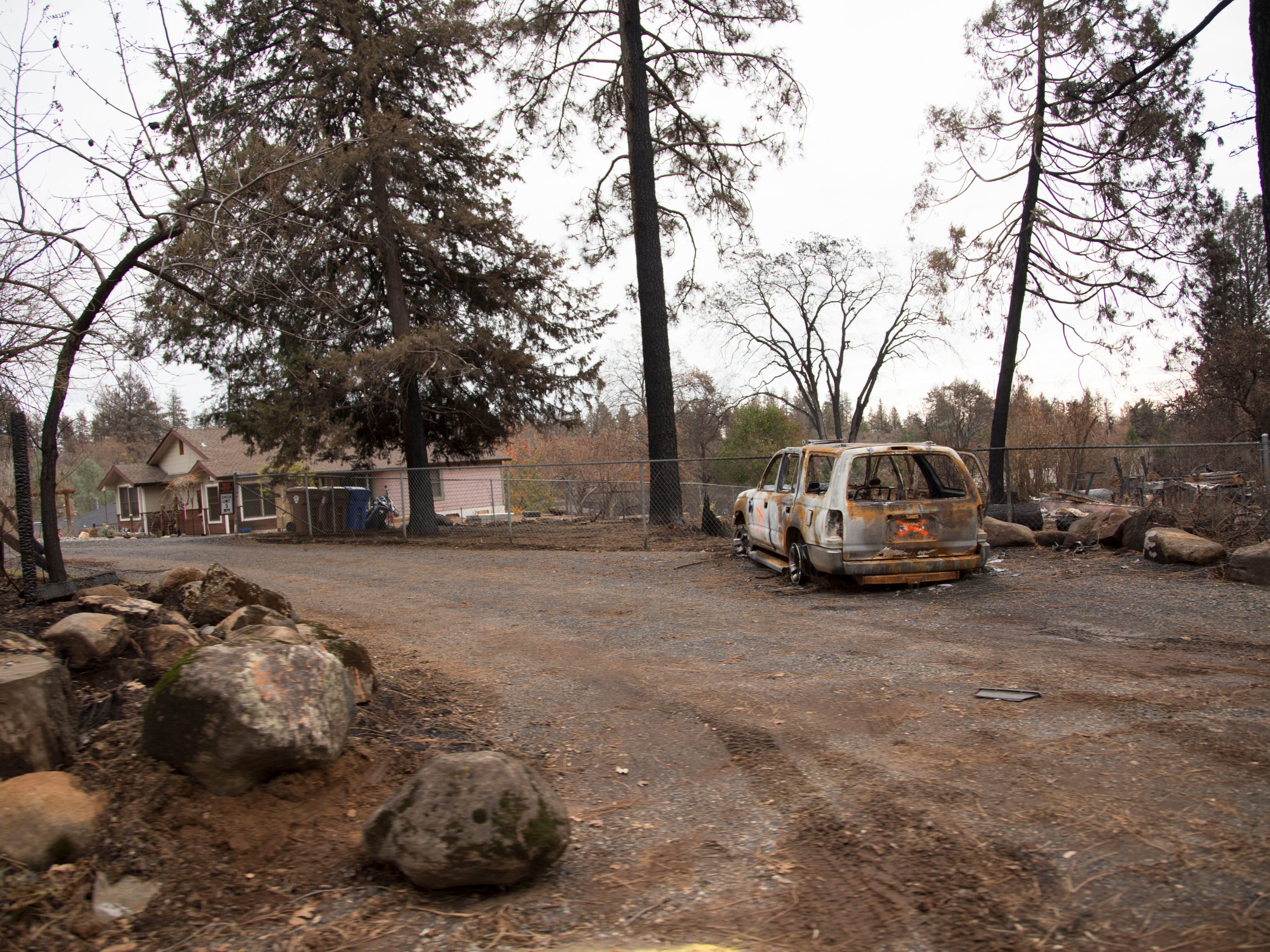 (Photo: A burned street in Paradise after the Camp Fire in November 2018 - Andrew Nixon / Capital Public Radio).
