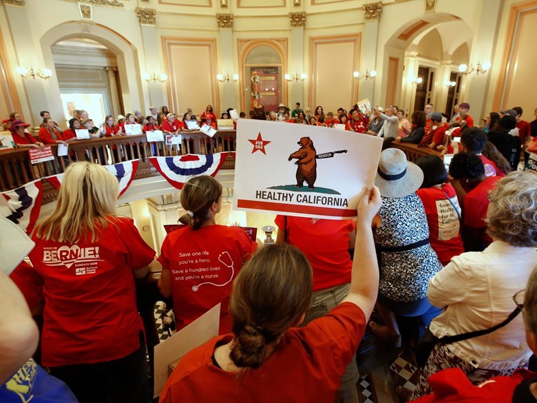 (Photo: Members of the California Nurses Association and supporters rally at the State Capitol calling for a single-payer health plan on June 28, 2017, in Sacramento - Rich Pedroncelli / AP Photo).