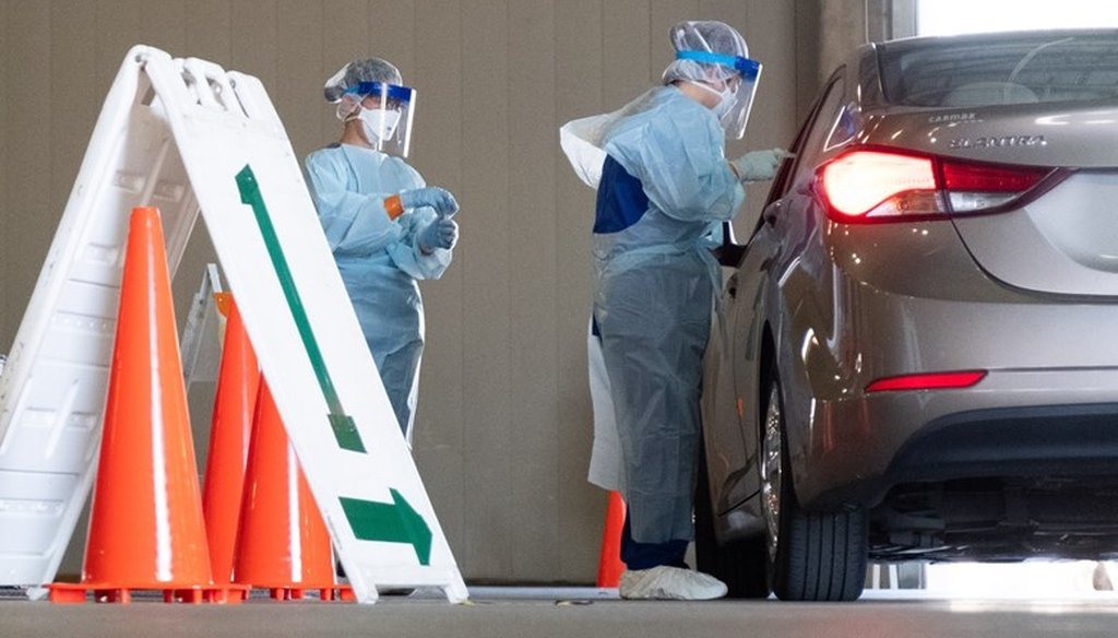 (Photo: Nurses in Sacramento, Calif., test a patient for COVID-19 in April - Andrew Nixon / CapRadio)