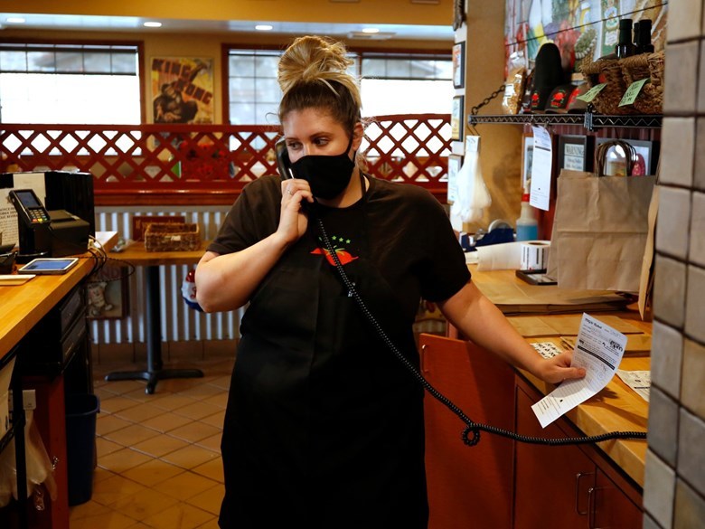(Photo: Stephanie Stoehr takes a call for a takeout order at the Dancing Tomato Caffe, in Yuba City, Calif., Tuesday, May 12, 2020 - Rich Pedroncelli / AP Photo / via CapRadio)