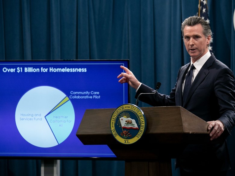 (Photo: Gov. Gavin Newsom, answering questions on his 2020-21 state budget on January 10, 2020, told reporters: ““You want to know who’s the homeless czar? I’m the homeless czar in the state of California.” - Anne Wernikoff for CalMatters)