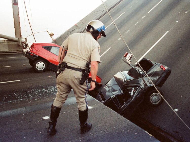 (Photo: A California Highway Patrol officer checks cars that fell when the upper deck of the San Francisco Bay Bridge collapsed onto the lower deck after the 1989 Loma Prieta earthquake - George Nikitin / AP / via Cap Radio)