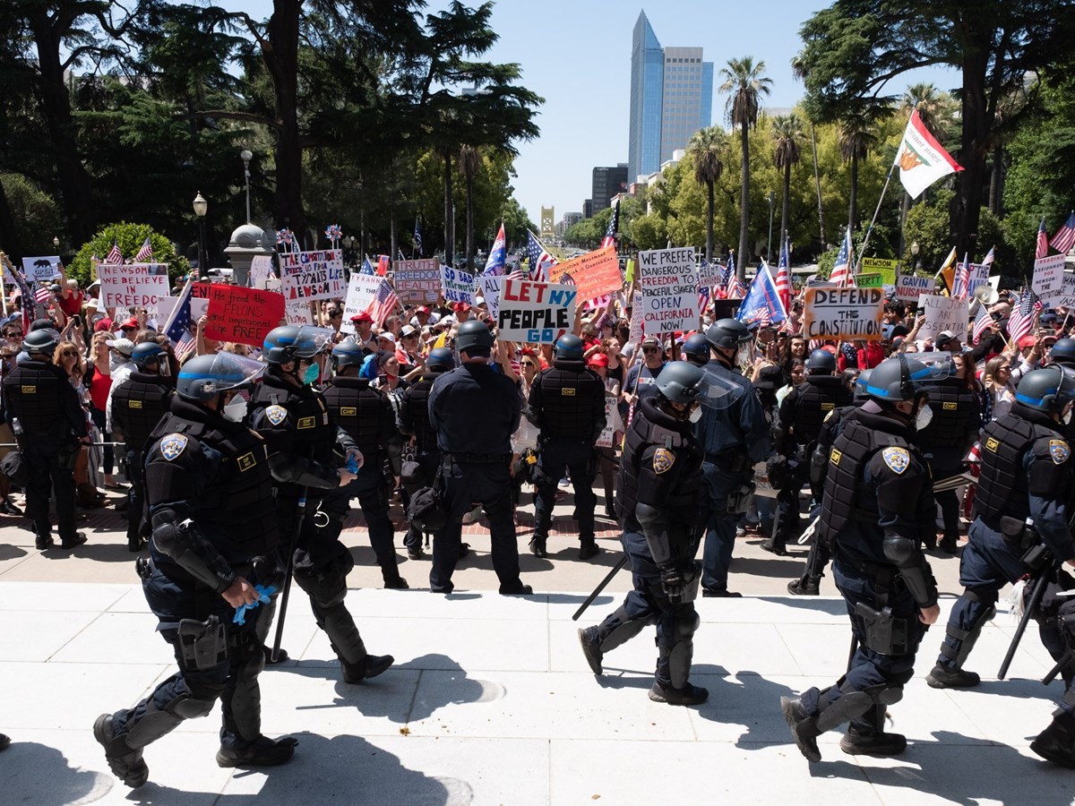 (Photo: CHP officers guard the Capitol steps during a demonstration on Friday, May 1, 2020 - Andrew Nixon / CapRadio).