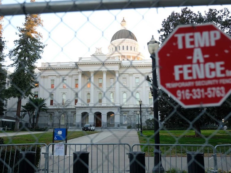 (Photo: A temporary fence surrounds the California State Capitol Thursday, Jan 14, 2021 - Andrew Nixon / CapRadio).