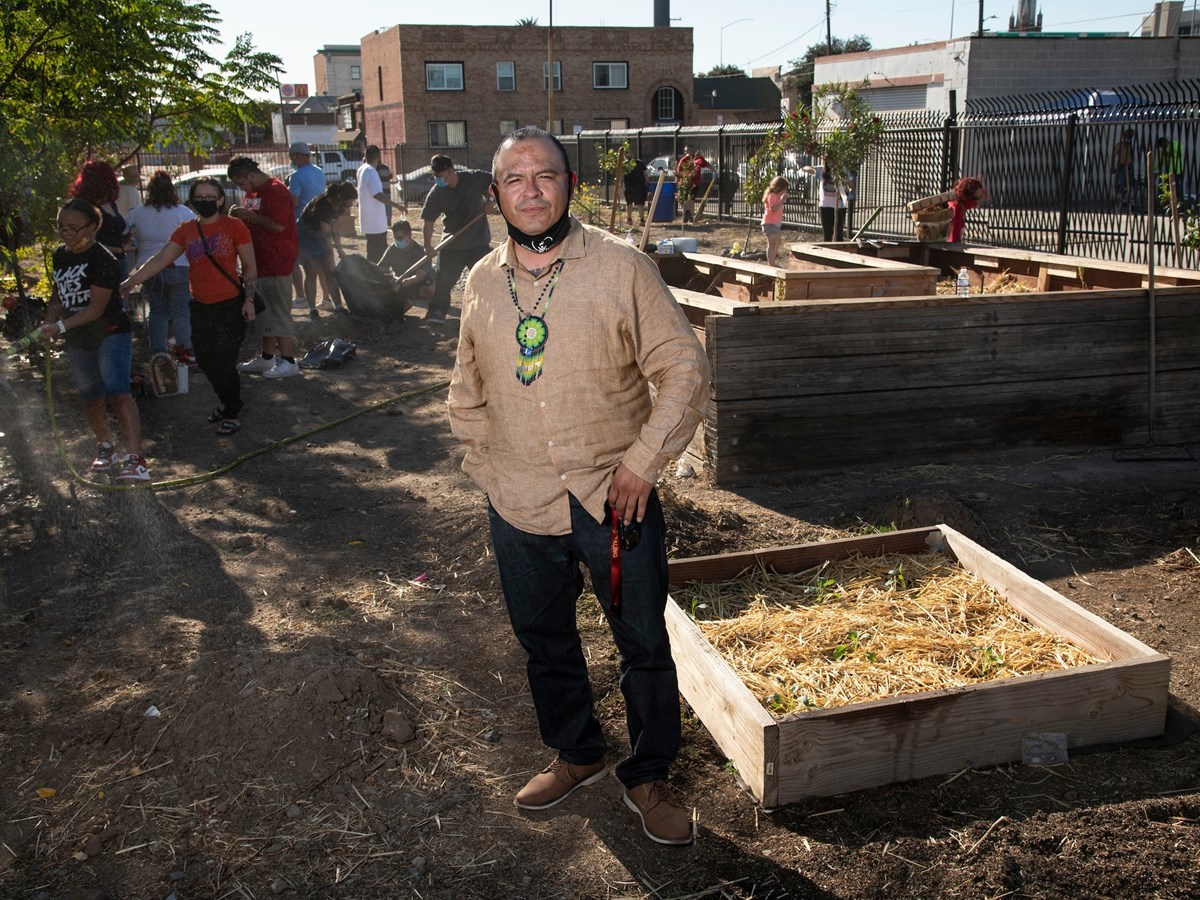 (Photo: Sammy Nunez, Founder and Executive Director of Fathers & Families of San Joaquin, poses for a portrait in the Brandon Harrison Memorial Garden in Stockton, Calif. on September 23, 2020 - Salgu Wissmath for palabra/CapRadio).