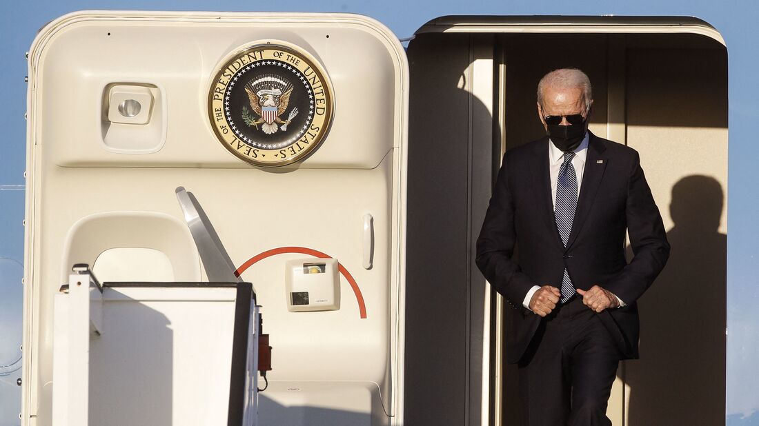 President Biden arrives aboard the Air Force One at Melsbroek Military Airport in Brussels,