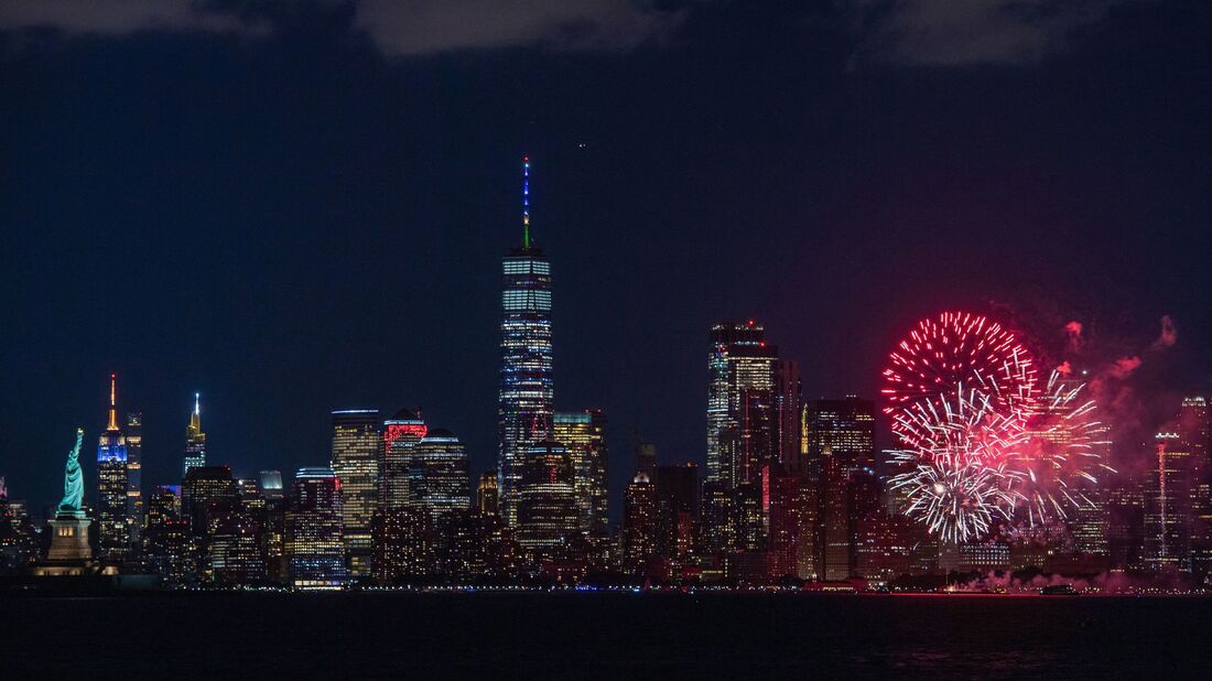 The Statue of Liberty and the New York skyline are seen as fireworks go