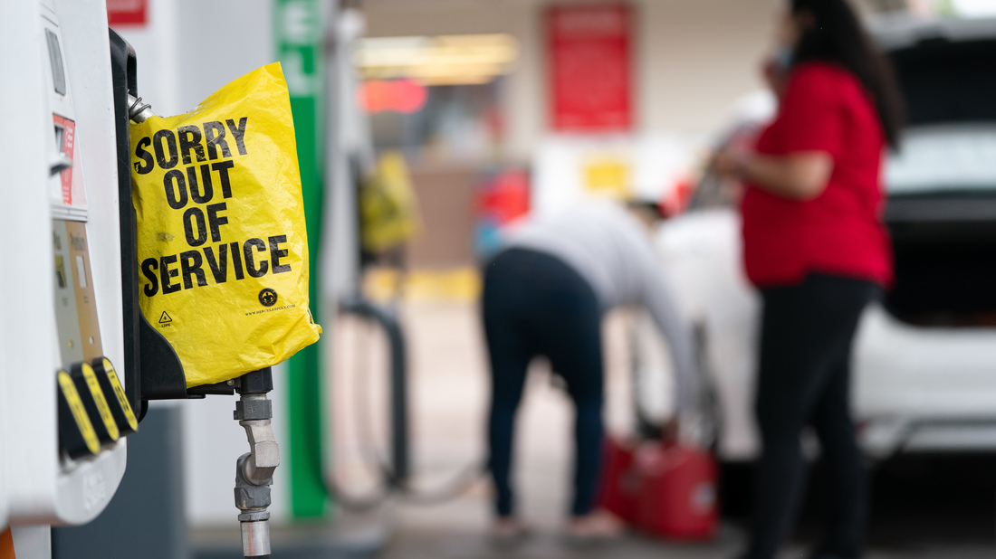An out of service bag covers a pump handle at a gas station May