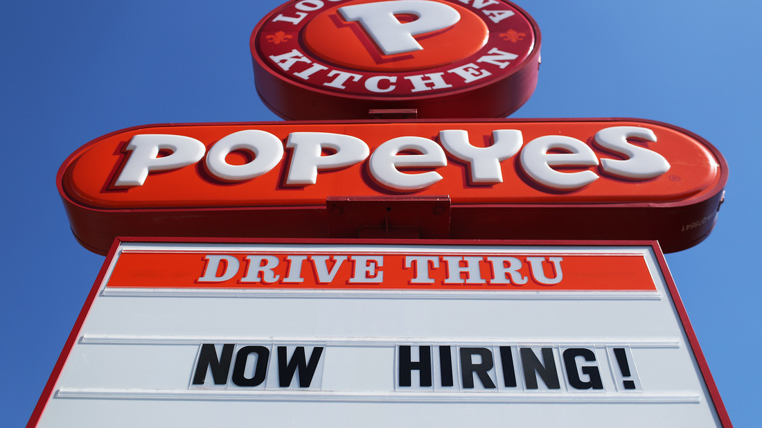 A 'Now Hiring' sign is posted in front of a Popeye's restaurant in Miami,