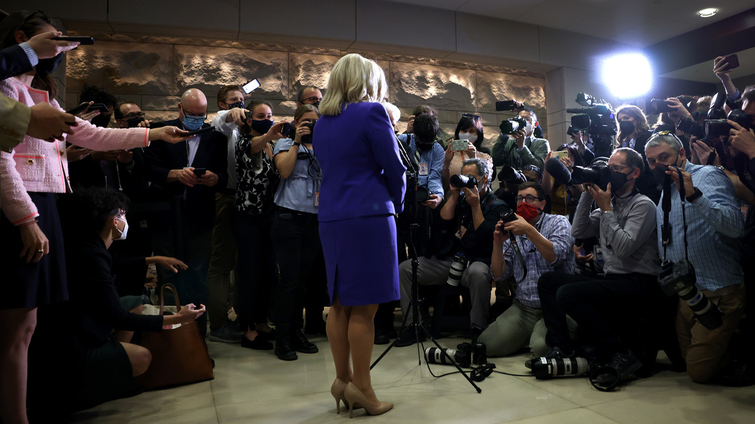 Rep. Liz Cheney speaks to the media after she was removed of her leadership