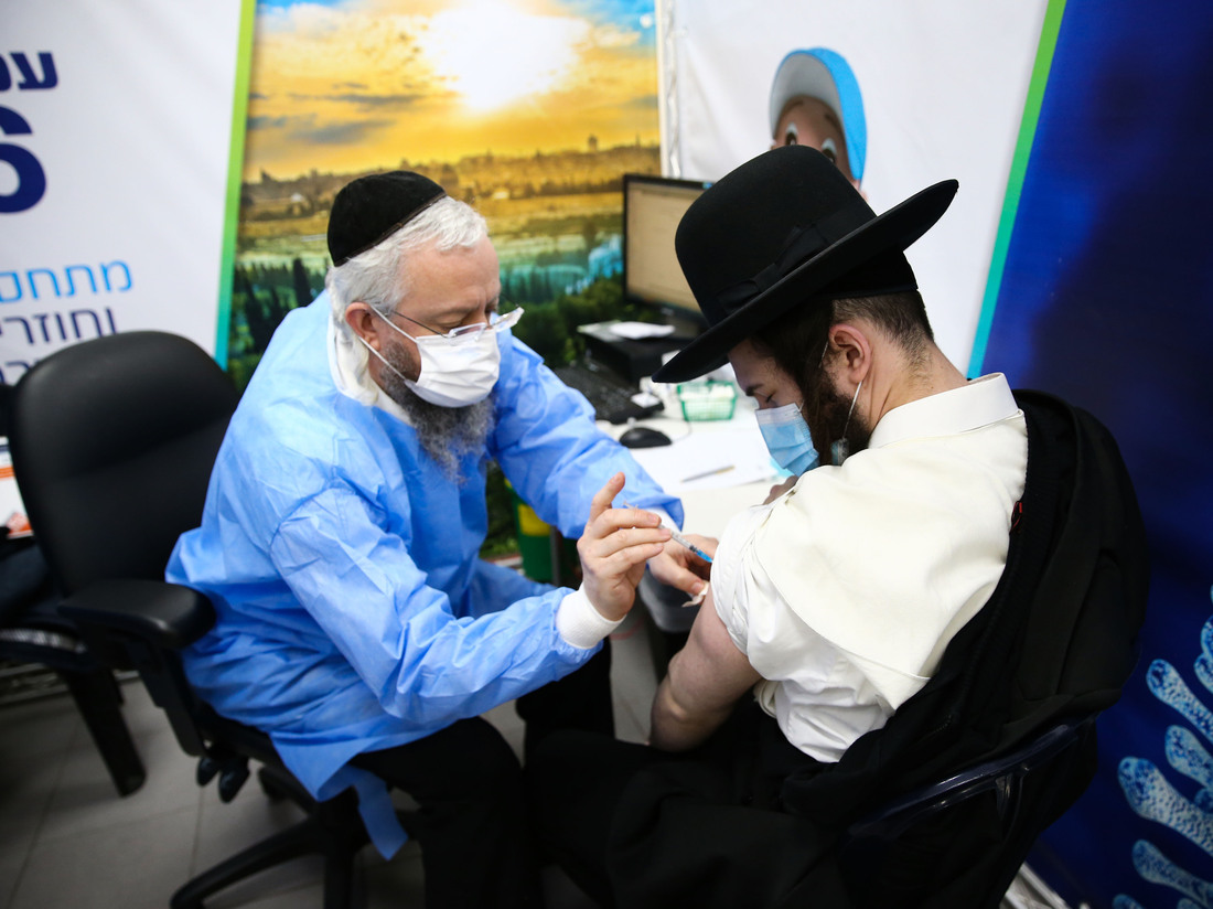 An ultra-Orthodox Jewish man receives a dose of the Pfizer-BioNtech vaccine in the Israeli