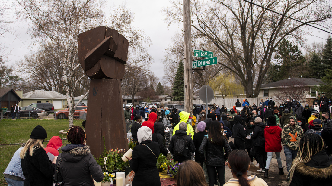 People gather around a sculpture of a raised fist during a vigil for Daunte