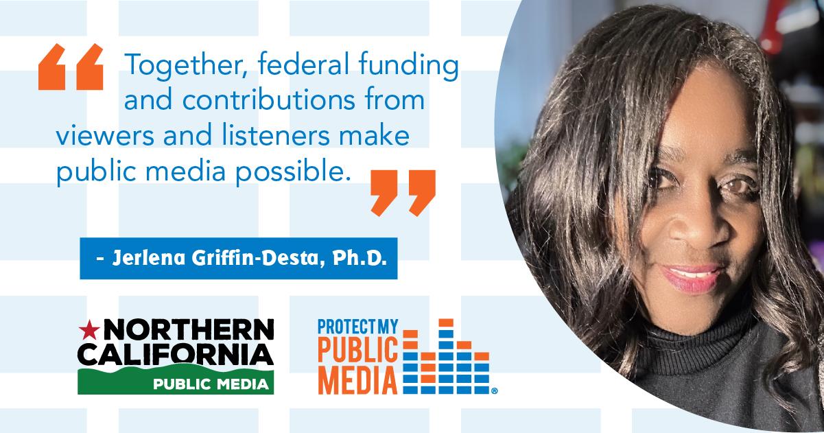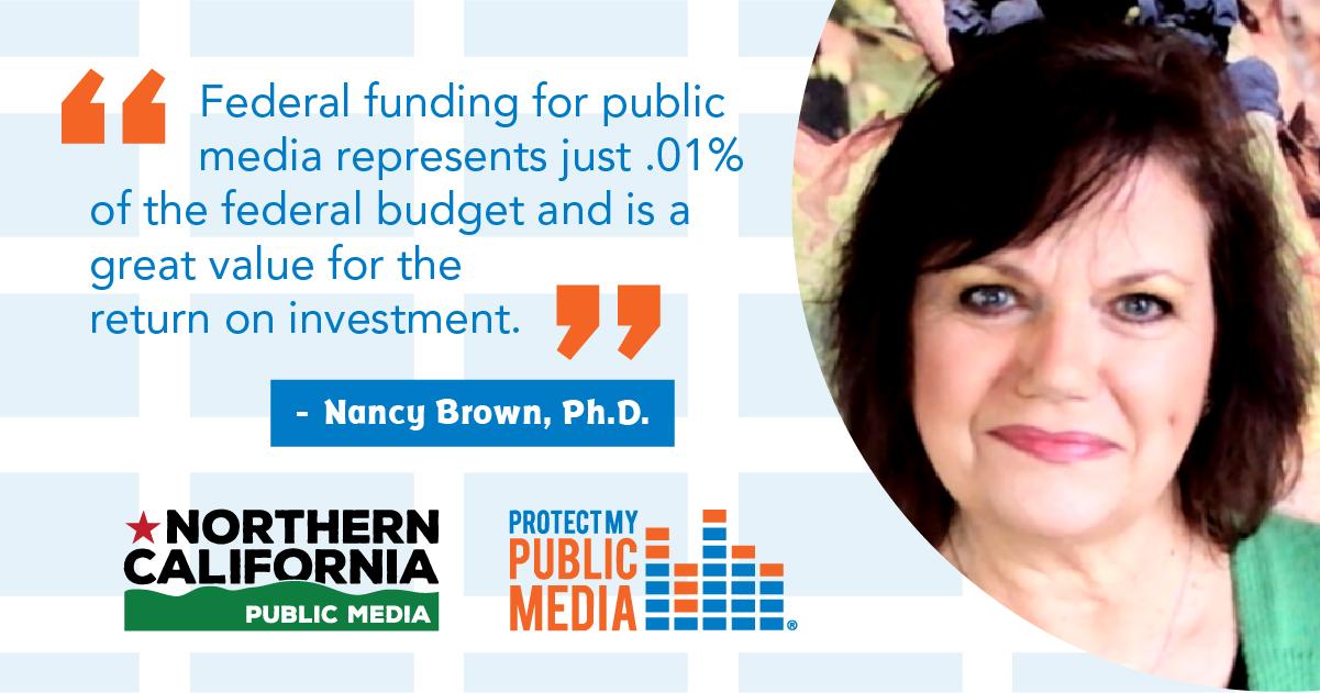 “Local public media stations are among the only locally owned and operated media outlets in the United States. Federal funding allows NorCal Public Media to focus on local needs and issues; from cultural programs that explore the arts to multi-media projects that explore public health and health disparities in our region. For some, NorCal Public Media is their only exposure to this essential community information.”