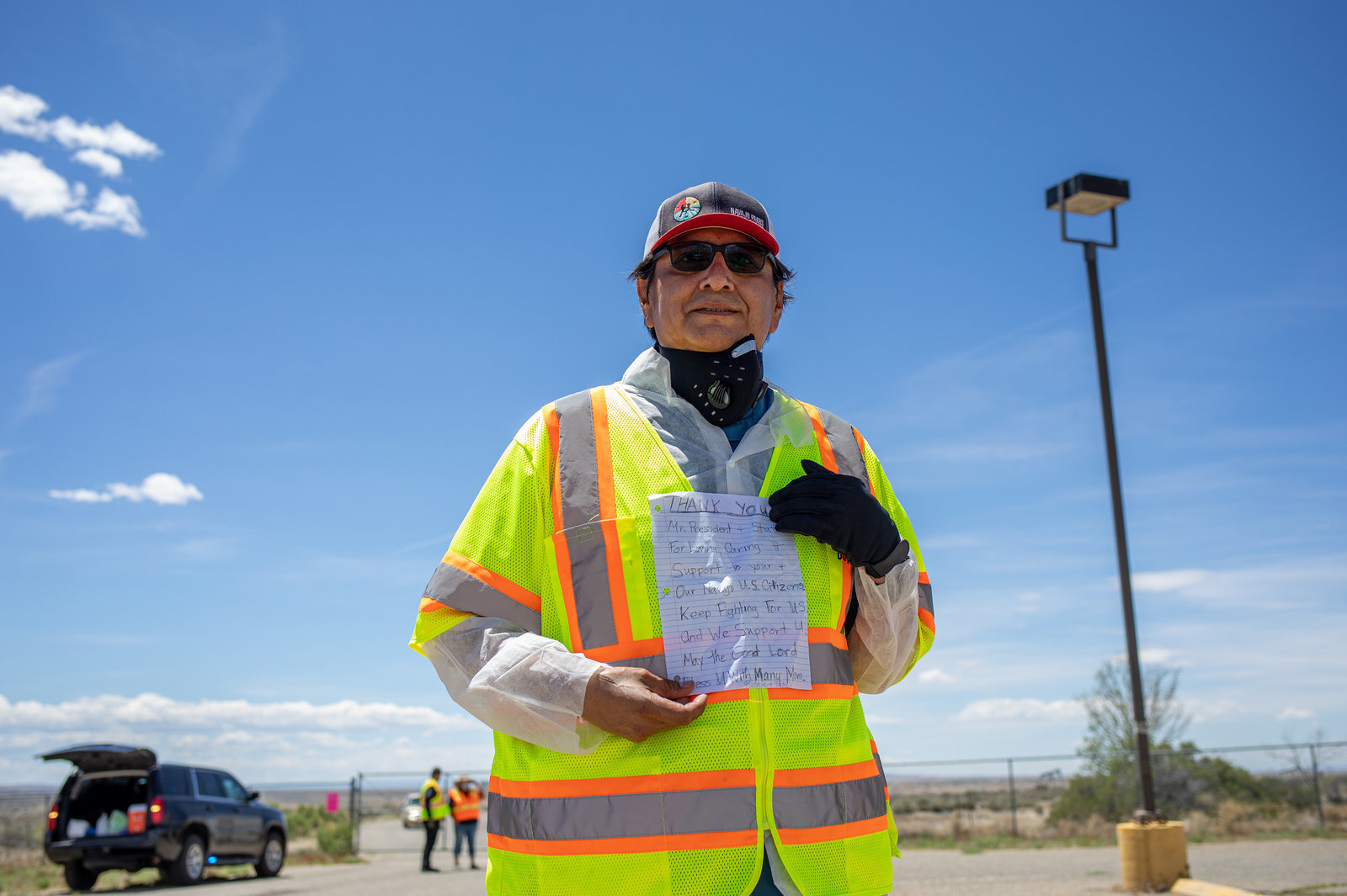 (Photo: Navajo Nation President Jonathan Nez holds a letter from a Navajo family while distributing food, water, and other supplies on May 27, on the Navajo Nation Reservation in New Mexico. Sharon Chischilly/Getty Images)